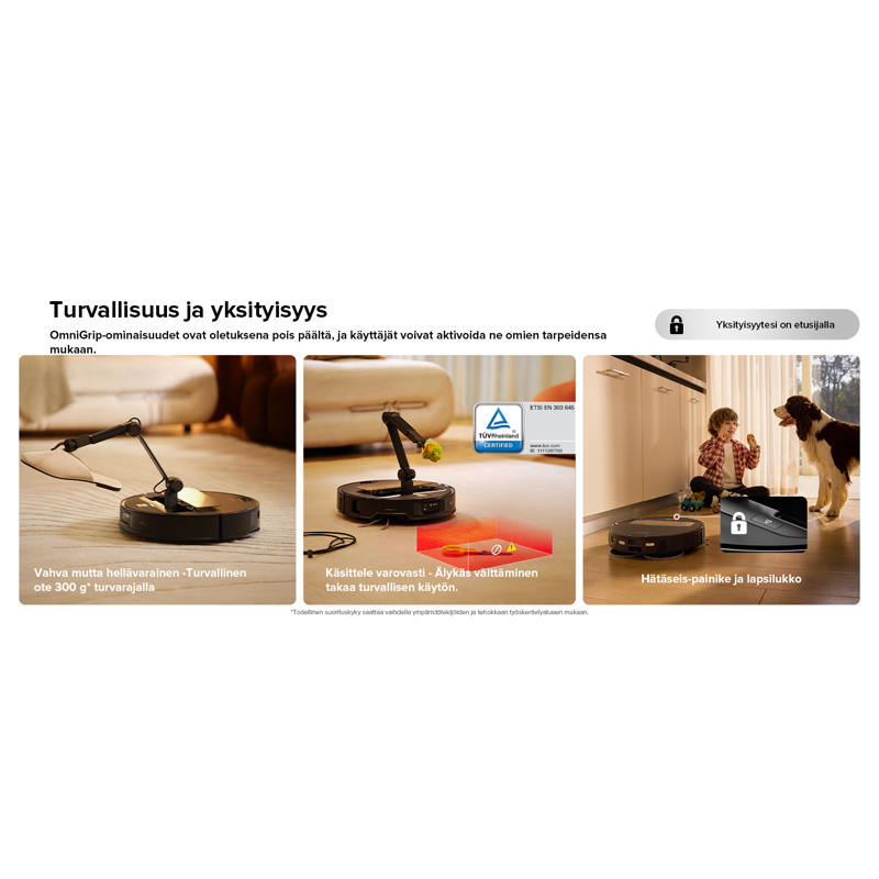 OmniGrip-ominaisuudet ovat oletuksena pois päältä, ja käyttäjät voivat aktivoida ne omien tarpeidensa mukaan. Saros Z70 voidaan pysäyttää fyysisesti milloin tahansa Hätäseis-painikkeella turvallisuuden lisäämiseksi. Lapsilukko helpottaa arkea lapsitalouksissa.