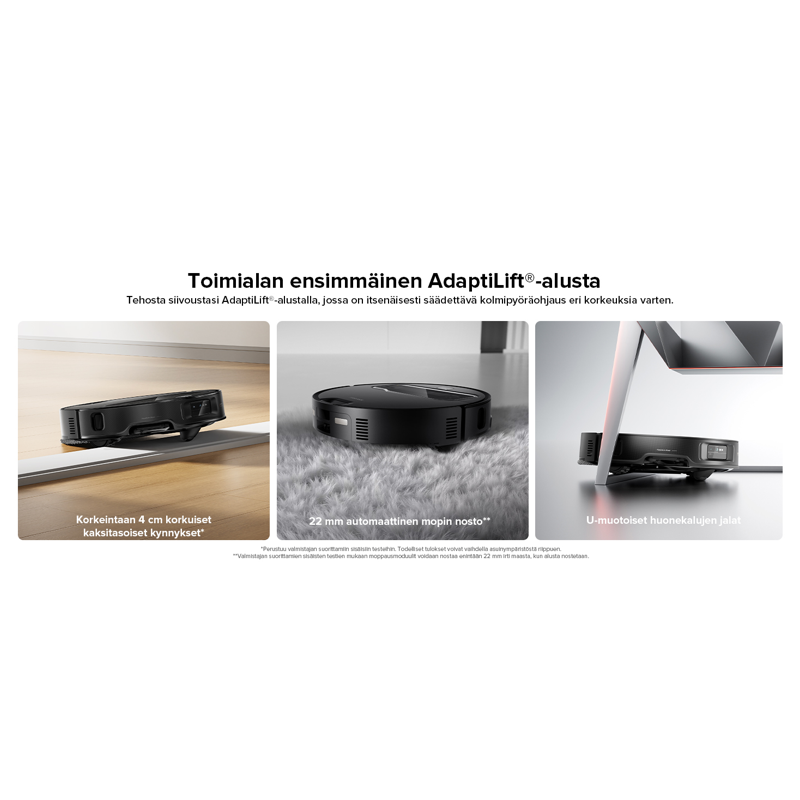 Tehosta siivoustasi AdaptiLift™-alustalla, jossa on itsenäisesti säädettävä kolmipyöräohjaus eri korkeuksia varten. Nosta koko alusta tai säädä itsenäisesti etuosaa, takaosaa, vasenta puolta tai oikeaa puolta valloittaaksesi haastavatkin kotiympäristöt ja varmistaaksesi optimaalisen siivoustehon.