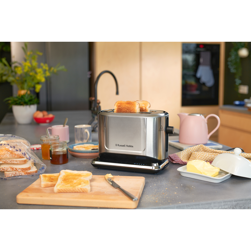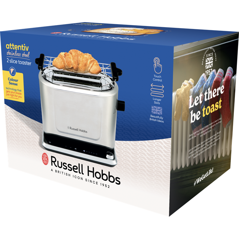 Attentiv-leivänpaahdin hyödyntää Colour Sense -teknologiaa, joka mukauttaa paahtoajan automaattisesti leipätyypin ja sävyn mukaan. Kaikki leivät eivät paahdu samalla tavalla. Leivän tyyppi, kosteuspitoisuus, paksuus, gluteenipitoisuus ja tuoreus voivat kaikki vaikuttaa toivottuun paahtoasteeseen, mikä voi aiheuttaa päänvaivaa. Sinun tarvitsee vain valita haluamasi paahtoaste, ja anna paahtimen hoitaa loput. 2 vuoden takuu ja yksi lisävuosi rekisteröitymällä Russell Hobbsin kotisivuilla.