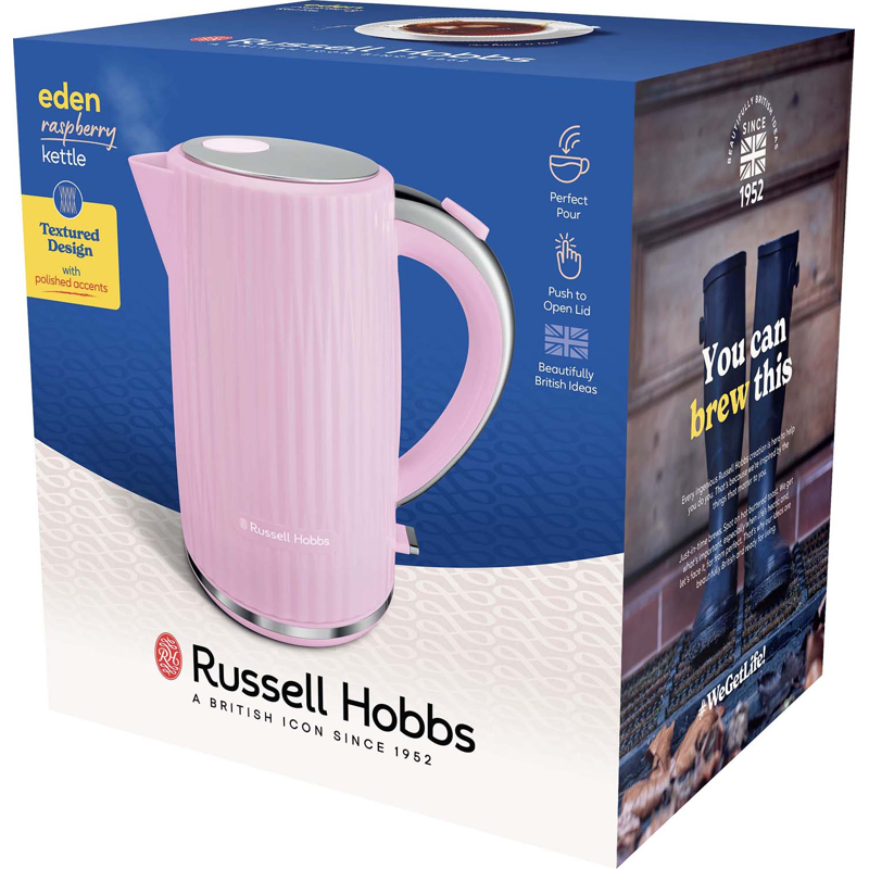 Russell Hobbsin Eden - vedenkeittimessä muotoilu ja suorituskyky yhdistyvät täydellisesti. Vesimäärän näytön ansiosta voit säästää energiaa kun keität vain tarvitsemasi määrän vettä. Painonappikannen täydellisen kaatonokan ja 360 asteen alustan myötä veden täyttäminen, keittäminen ja kaataminen käyvät sujuvasti.