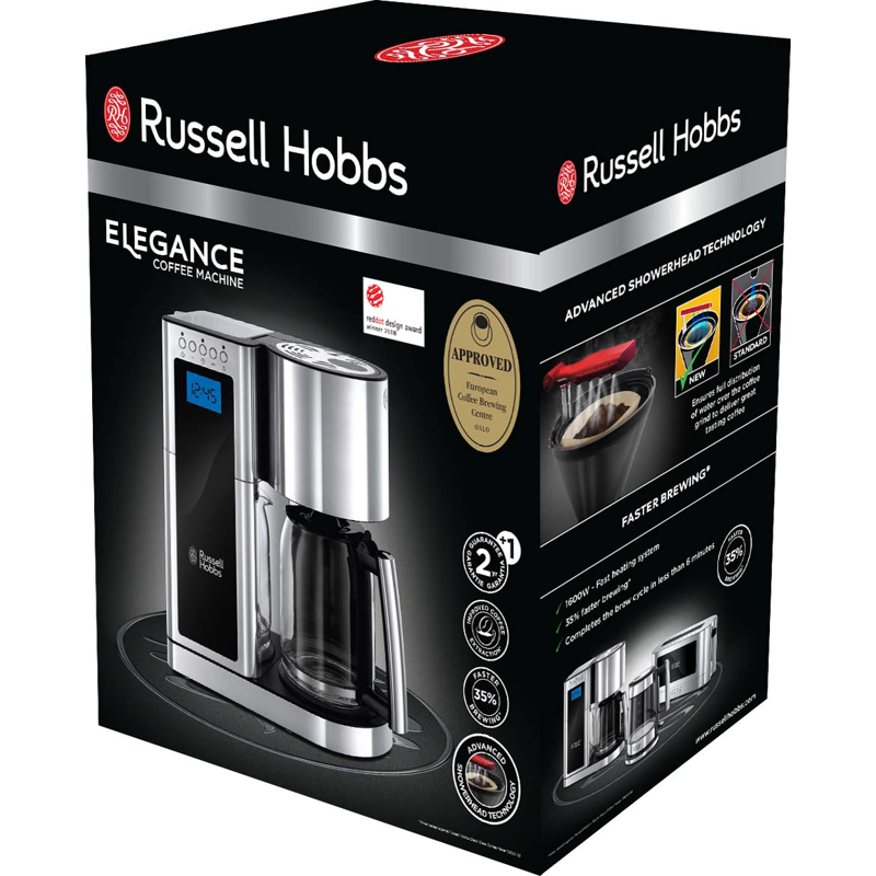 Russell Hobbs Elegance on tyylikäs ja helppokäyttöinen kahvinkeitin, jolla keität 10 kuppia kahvia kerrallaan. Laite on varustettu 24 tunnin ajastimella, joten voit säätää sen käynnistymään juuri oikeaan aikaan. Automaattinen lämpimänäpitotoiminto pitää kahvisi lämpimänä enintään 40 minuuttia, jonka jälkeen laite sammuu automaattisesti. Kahvinkeittimessä on irrotettava ja pestävä suodatin, tippalukko sekä automaattinen puhdistustoiminto.