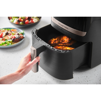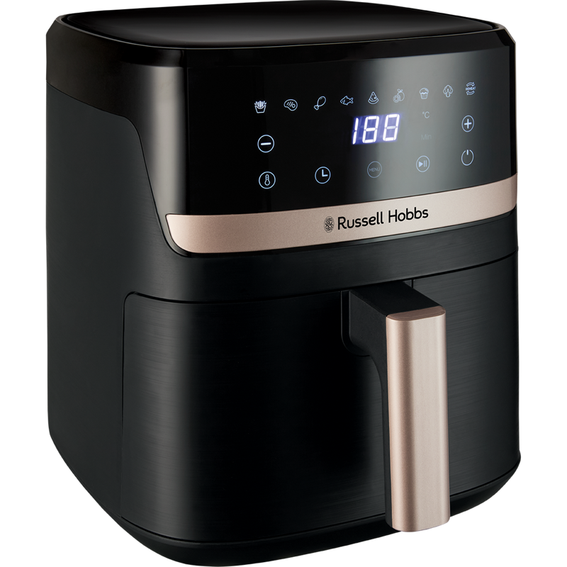 Jos tupa on täynnä päivällisaikaan tai koulusta on vyörynyt kotiin joukko nälkäisiä lapsia, Russell Hobbs 5,5 litran Satisfry Air airfryer hoitaa homman. Suuren kypsennysalueen ja nopeiden ja tehokkaiden ruoanlaittotilojen avulla loihdit herkullisen aterian tai välipalan hetkessä. Klassinen musta runko ja tyylikkäät samppanjansävyiset yksityiskohdat tuovat keittiöön modernia ilmettä.