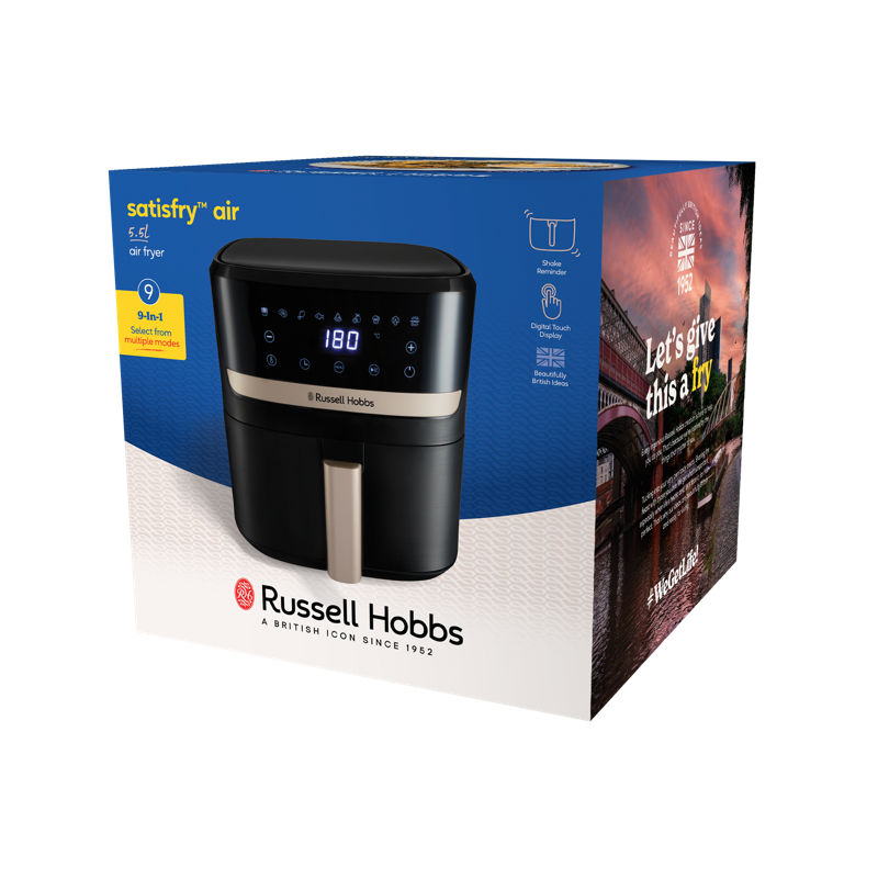- Jos tupa on täynnä päivällisaikaan tai koulusta on vyörynyt kotiin joukko nälkäisiä lapsia, Russell Hobbs 5,5 litran Satisfry Air airfryer hoitaa homman