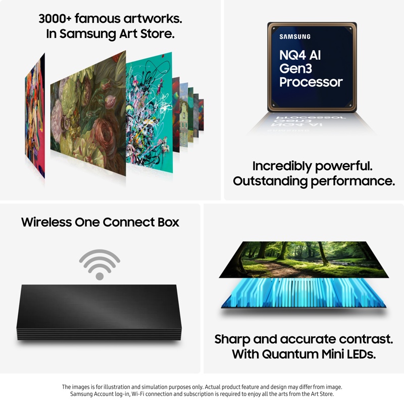 *Samsung-tilille kirjautuminen ja Wi-Fi-yhteys vaaditaan. Edellyttää tilauksen, jotta voit nauttia kaikista Art Storen taideteoksista. Tarjoaa 30 kuukausittain vaihtuvaa taideteosta Art Store Streamsin kautta ja yli 70 ambient-sisältöä, jotka ovat saatavilla ilmaiseksi ympäri vuoden.Liikesensori aktivoituu päälle kytkemisen jälkeen ja se toimii vain Art Mode -tilassa. Suorituskyky voi vaihdella valaistusolosuhteiden mukaan.