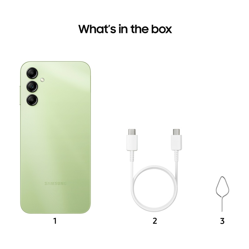 Galaxy A14 5G:n lisäksi: johto (USB-C), SIM-kortin poistotyökalu sekä pikaohje