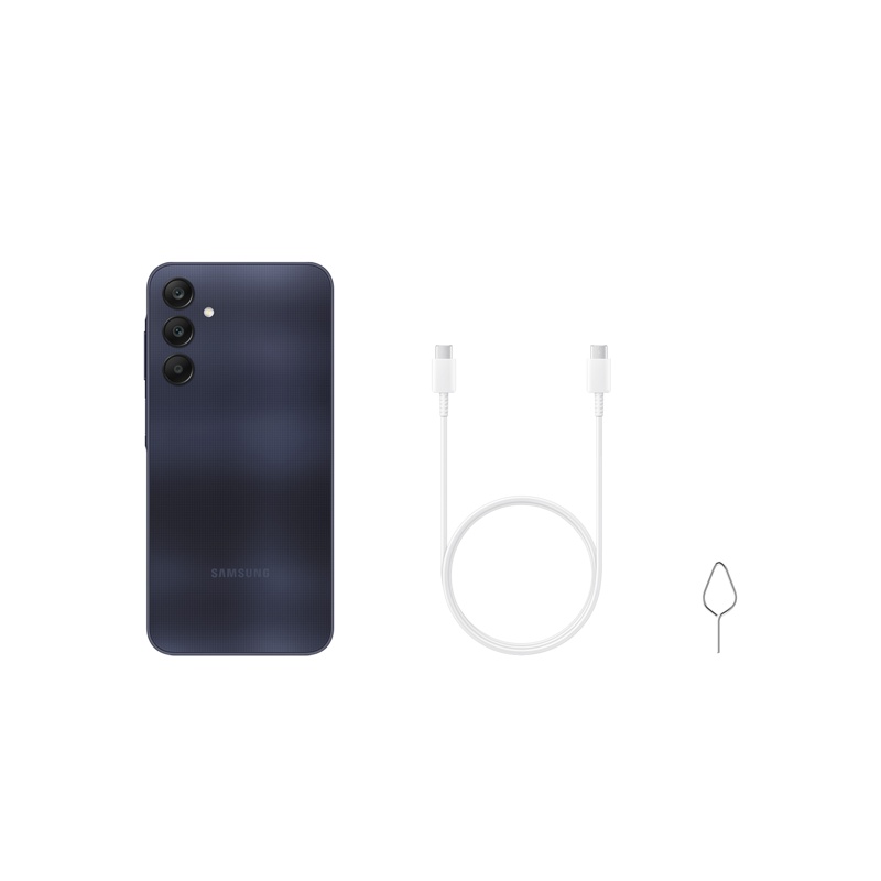 Galaxy A25 5G:n lisäksi: johto (USB-C), SIM-kortin poistotyökalu sekä pikaohje. Kaikki lisävarusteet tulevat valkoisena puhelimen väristä riippumatta