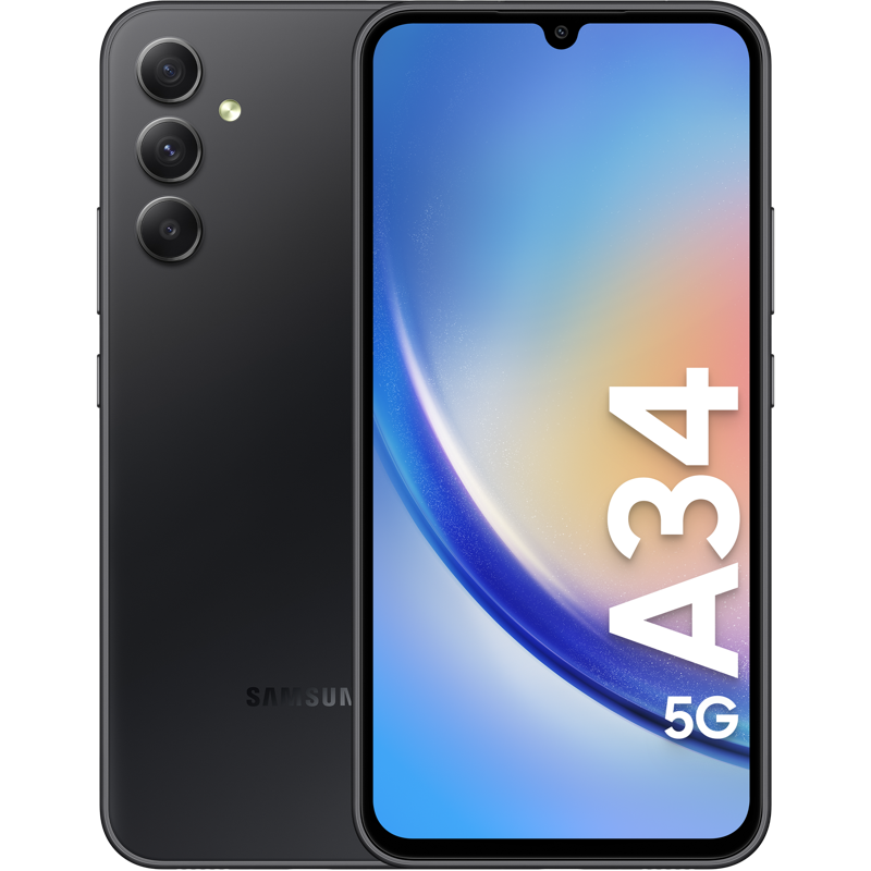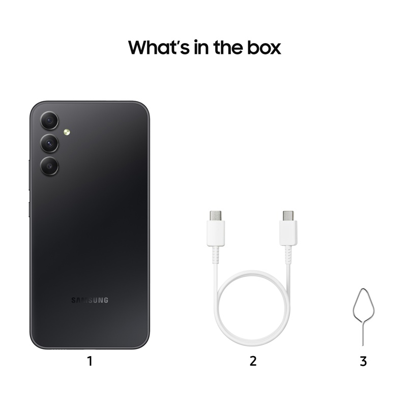 Galaxy A34 5G:n lisäksi: johto (USB-C), SIM-kortin poistotyökalu sekä pikaohje