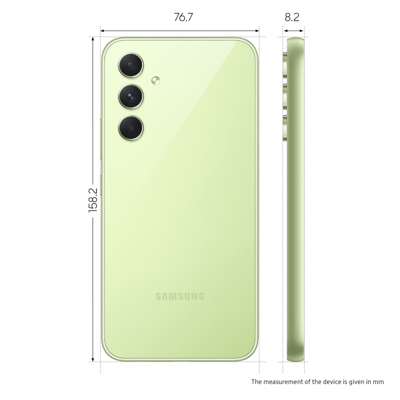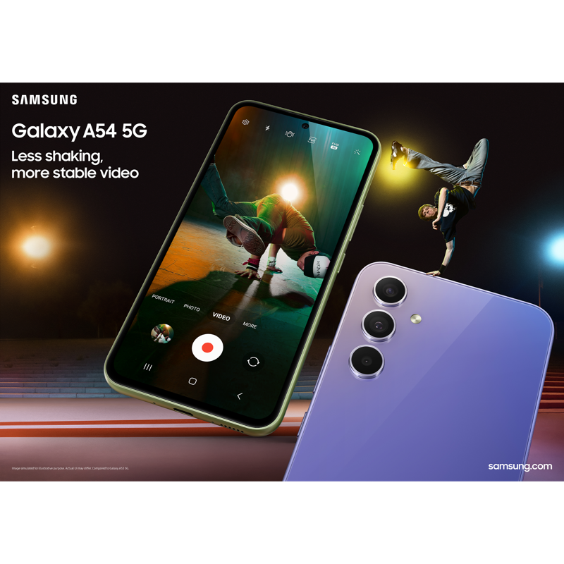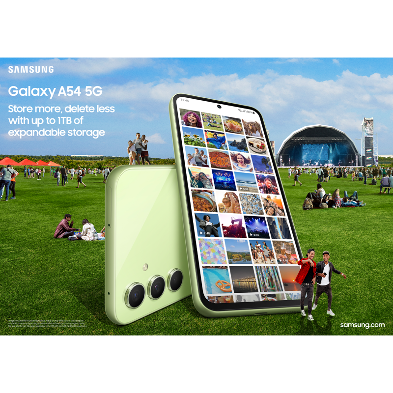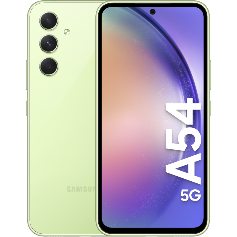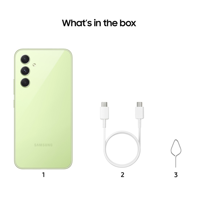 Galaxy A54 5G:n lisäksi: johto (USB-C), SIM-kortin poistotyökalu sekä pikaohje.