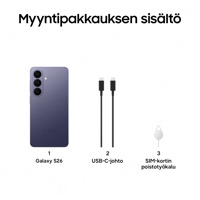 Samsung Galaxy S26, USB Type-C -johto (mukautettu 60 W lataukseen), SIM-kortin poistotyökalu, pikaopas