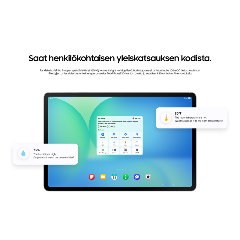 Tunne olosi turvalliseksi Home AI:n avulla. Liitä kodin kaikki älylaitteet Galaxy Tab S10 FE:hen, niin saat nopean ja selkeän yleiskuvan suurella näytöllä. Voit saada tietoa tarvittavista toimenpiteistä, kuten ilmalämpöpumpun suodattimen vaihtamisesta, tai energian kulutuksesta ja fiksuista säästötoimista.