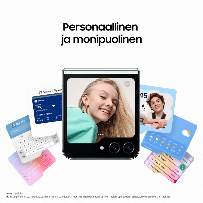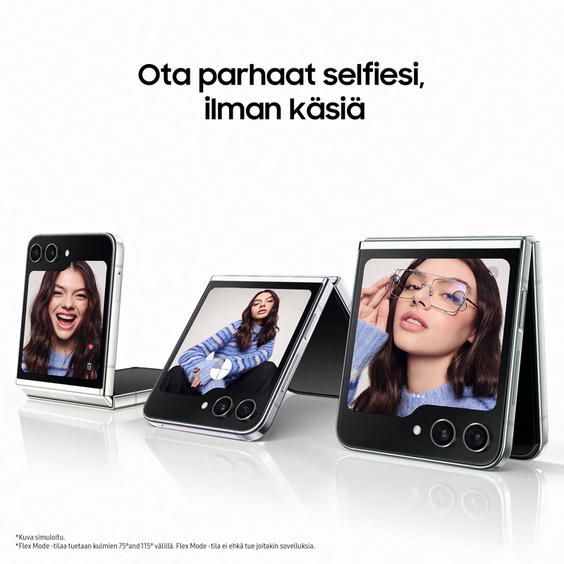 - 6,7” 120 Hz:n taitettava ja dynaaminen päänäyttö sekä 3,4” etunäyttö älykkäillä ominaisuuksilla – Galaxy Flip5:llä näet ja hallitset sinulle tärkeitä asioita