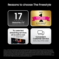 Smart Edge Blending – Toiminto joka mahdollistaa entistä suuremman kuvaelämyksen entistä laajemmalla kuvasuhteella ja jopa 160-tuuman kuvakoossa yhdistämällä kaksi The Freestyle -projektoria yhteen. (Toiminto tuettu SmartView -näytönpeilausta käytettäessä).