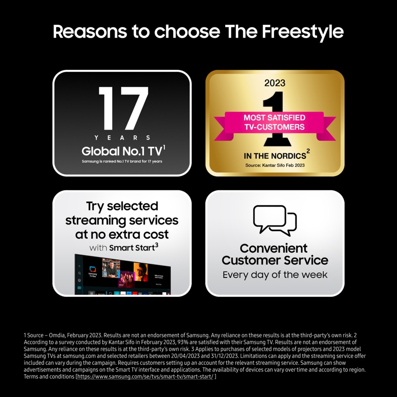 Samsung TV Access -toiminto – Nauti The Freestyle -projektorilla televisiosi sisällöstä, olipa televisio kiinni tai auki. (Palvelu toimii ainoastaan yhteensopivien Samsungin TV-mallien kanssa (2017 Samsung Q7x-mallista ylöspäin).