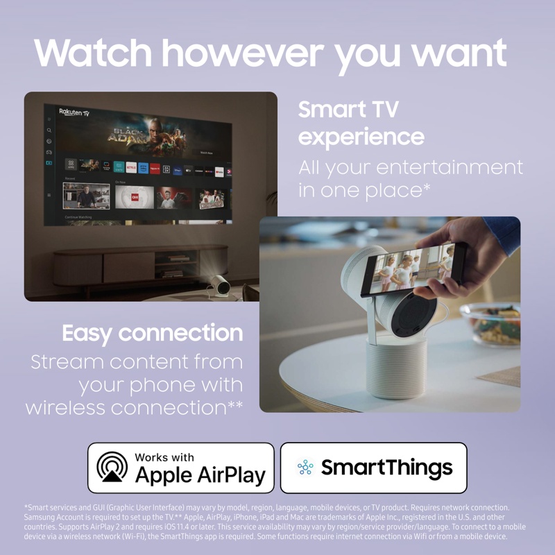 *Toimii 2. sukupolven (SP-LFF3CLAXXXE) ja 1. sukupolven (SP-LSP3BLAXXE) projektorien kanssa, jos ne on päivitetty uusimpaan ohjelmistoversioon. Edellyttää yhteyden SmartThings-sovellukseen.