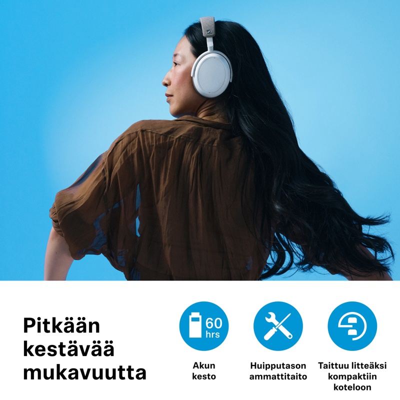 Sennheiser Momentum 4 -vastamelukuulokkeiden kevyt muotoilu, pehmustettu sanka ja syvät, pehmustetut korvakupit takaavat pitkäkestoisen pitomukavuuden. Vähäkitkainen saranamekanismi sallii samalla helpon säädön ja antaa sinulle upean istuvuuden ilman painetta päälaella.