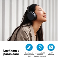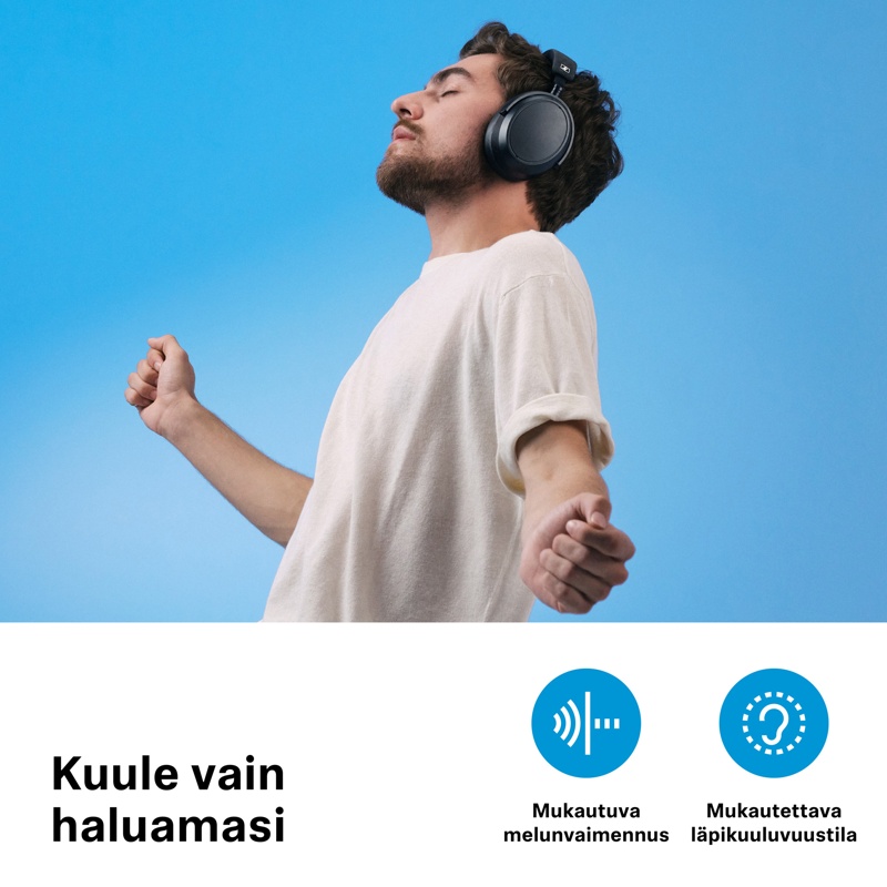 Uuden sukupolven sopeutuva melunvaimennus sopeutuu automaattisesti ulkoiseen meluun, ja sinä voit pysyä uppoutuneena ja kuulla jokaisen yksityiskohdan myös meluisissa ympäristöissä. Haluatko kuulla kuulutukset junassa tai työtoverisi kysymykset? Aktivoi joustava läpikuuluvuustila koskettamalla kuullaksesi ulkoiset äänet ottamatta pois kuulokkeitasi.