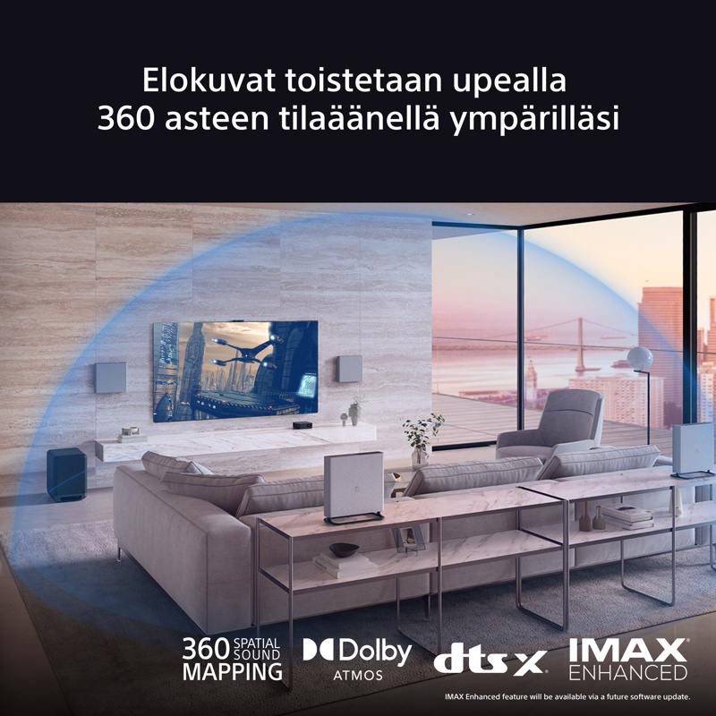 Bravia Theatre Quad tarjoaa täydellisen surround-äänikokemuksen, sillä 360 Spatial Sound Mapping -teknologiamme luo haamukaiuttimet ympäri huonettasi, joten tuntuu kuin olisit itse näyttämöllä. Dolby Atmos ja DTS:X ovat kaksi teknologiaa suoraan elokuvateatterista, nyt olohuoneessasi, ja IMAX Enhanced -sertifioinnin ansiosta voit tuoda aidon elokuvakokemuksen kotiin.