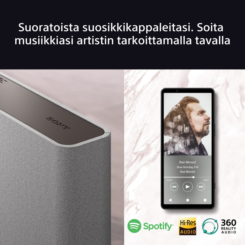Bravia Theatre Quad ei ole vain elokuvia varten, vaan voit kuunnella musiikkia poikkeuksellisen yksityiskohtaisesti ja kirkkaasti. High-Resolution Audio tarjoaa ylivoimaisen äänenlaadun, 360 Reality Audio on immersiivinen musiikkikokemus, joka saa sinut tuntemaan kuin olisit studiossa, ja DSEE Extreme skaalaa jokaisen kappaleen suuremmaksi.