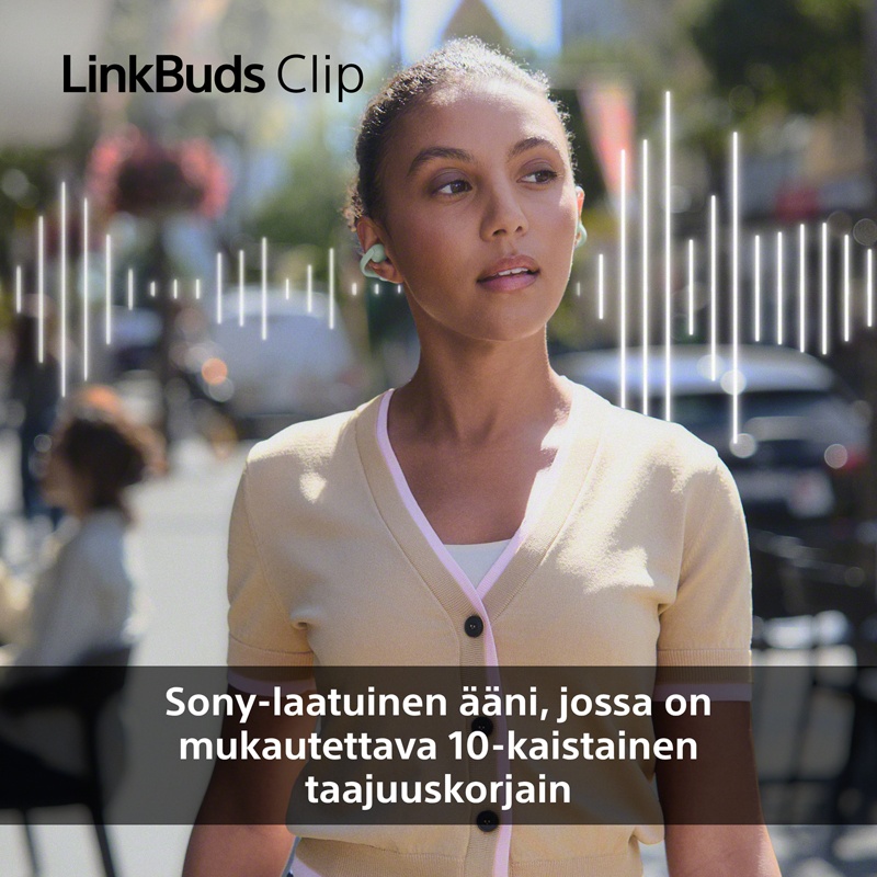 LinkBuds Clip -kuulokkeet tarjoavat selkeät handsfree-puhelut luujohtotekniikalla, joka tunnistaa puhujan äänen tarkasti jopa vilkkaissa ympäristöissä, ja AI Noise Reduction -vastamelulla, joka poistaa ei-toivotun taustamelun. Voit jopa mykistää ja poistaa mykistyksen suoraan korvakuulokkeista.