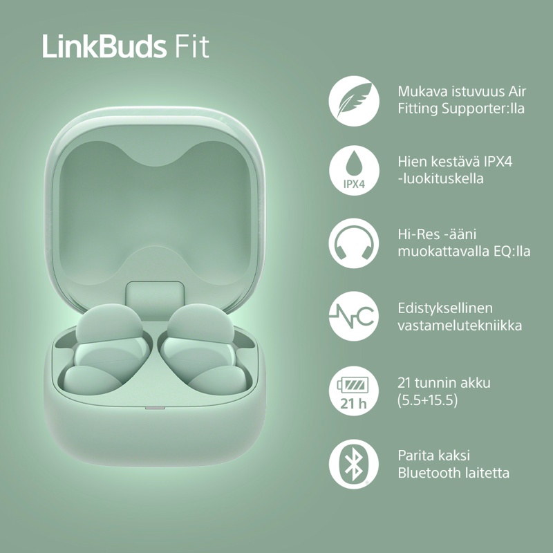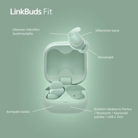 LinkBuds Fit tarjoaa yhteensä 21 tunnin toiston (5,5 tuntia korvakuulokkeiden kanssa + 15,5 tuntia kotelon kanssa) sekä pikalatauksen (1 tunnin toisto vain 5 minuutin latauksen jälkeen).