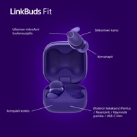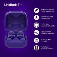 LinkBuds Fit tarjoaa yhteensä 21 tunnin toiston (5,5 tuntia korvakuulokkeiden kanssa + 15,5 tuntia kotelon kanssa) sekä pikalatauksen (1 tunnin toisto vain 5 minuutin latauksen jälkeen).