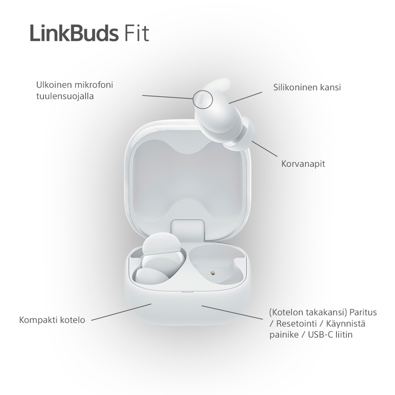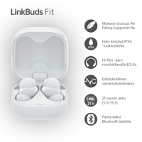LinkBuds Fit tarjoaa yhteensä 21 tunnin toiston (5,5 tuntia korvakuulokkeiden kanssa + 15,5 tuntia kotelon kanssa) sekä pikalatauksen (1 tunnin toisto vain 5 minuutin latauksen jälkeen).