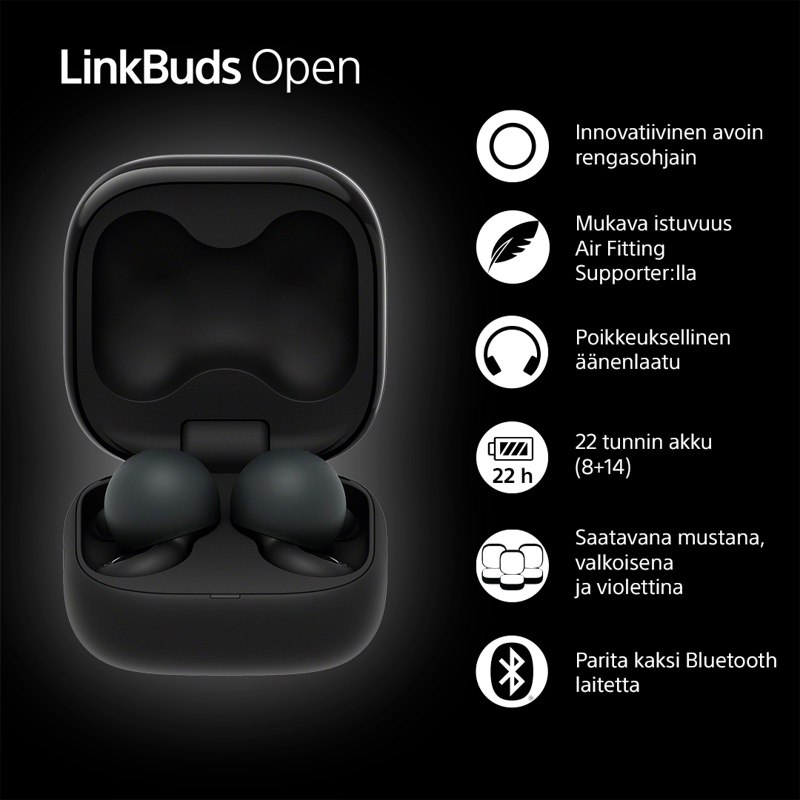 Ergonominen muotoilu istuu mukavasti korvaan, ja uusi ilmatyyny pitää kunkin kuulokkeen tukevasti paikallaan. LinkBuds Open -kuulokkeet painavat vain 4,8 g, joten ne sopivat erinomaisesti koko päivän käyttöön ja urheiluun.