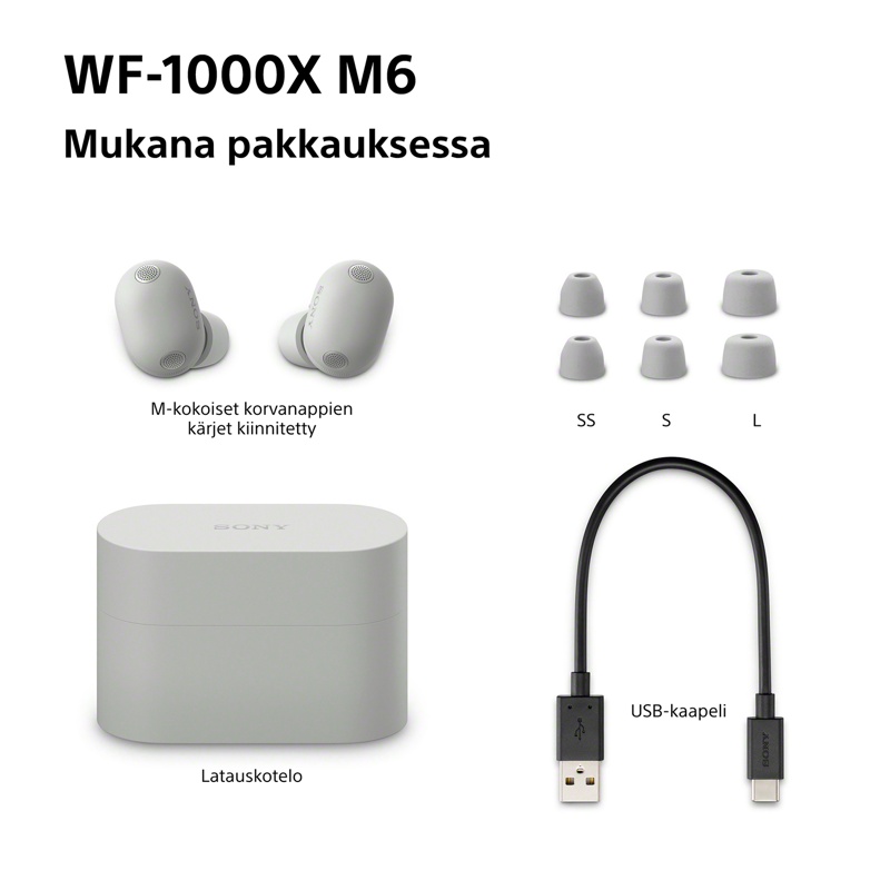 Kuulokkeet, joissa M-kokoiset korvanappien kärjet kiinnitetty, SS, S ja L-kokoiset korvanappien kärjet, latauskotelo, USB-kaapeli