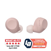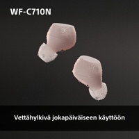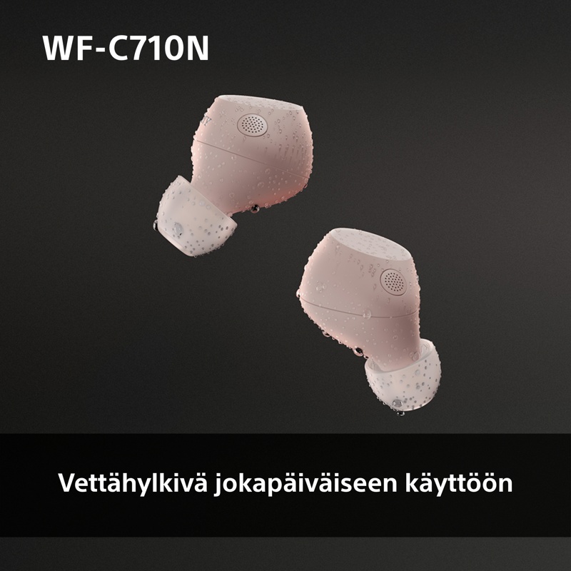 WF-C710N -korvanappien vettähylkivyysluokitus on IPX4. Kuulokkeet siis kestävät hikeä ja sadetta, joten voit käyttää niitä sisätiloissa ja ulkona luottavaisin mielin.