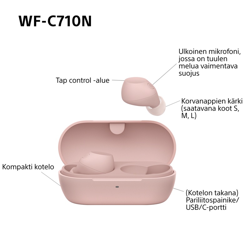 Sony WF-C710N -vastamelukuulokkeet, latauskotelo, USB-kaapeli, S, M ja L kokoiset korvasovitteet