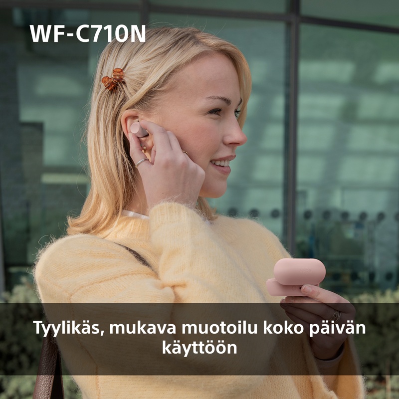 WF-C710N on saatavana väreissä Musta, Valkoinen, Pinkki ja Glass Blue (jännittävä läpinäkyvä muotoilu). WF-C710N -korvanapit ovat pienet, kevyet ja mukavat, joten voit käyttää niitä koko päivän ja keskittyä musiikkiin tyylillä.