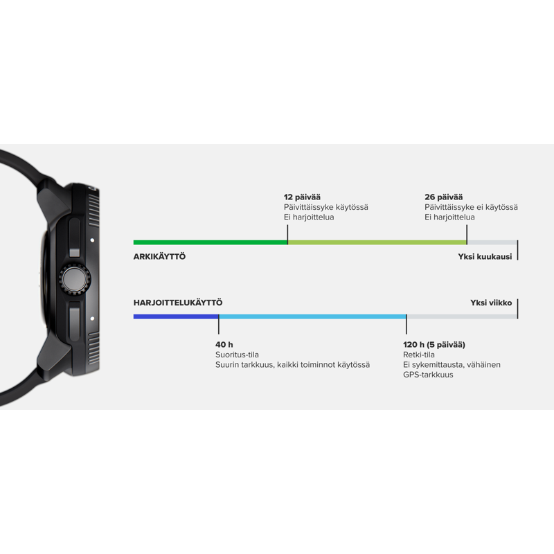 - Akun kesto jopa 40 tuntia harjoittelun seurantaa kaikkein tarkimmalla GPS-asetuksella ja jopa 26 päivää päivittäistilassa
