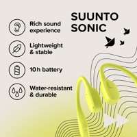 Suunto Sonic -kuulokkeet on suunniteltu urheiluun. Ne ovat kevyet ja asettuvat korville tuntuen miellyttäviltä käytössä. Suunto Sonic -kuulokkeet pysyvät vakaasti paikoillaan ja toistavat musiikin luotettavasti myös silloin, kun juokset haastavassa maastossa tai pyöräilet kivikkoisella reitillä.