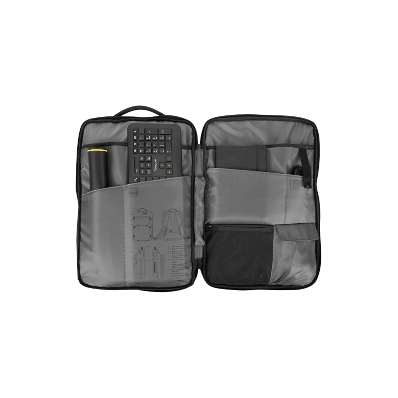 Matkapuhelin, henkilökohtaiset lisävarusteet, digitointikynä, hiiri, näppäimistö, avaimet, lompakko, sadesuoja, vetoketjulliset verkkotaskut, piilotettu vesipullonpidike, lannerangan pehmustettu tasku