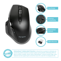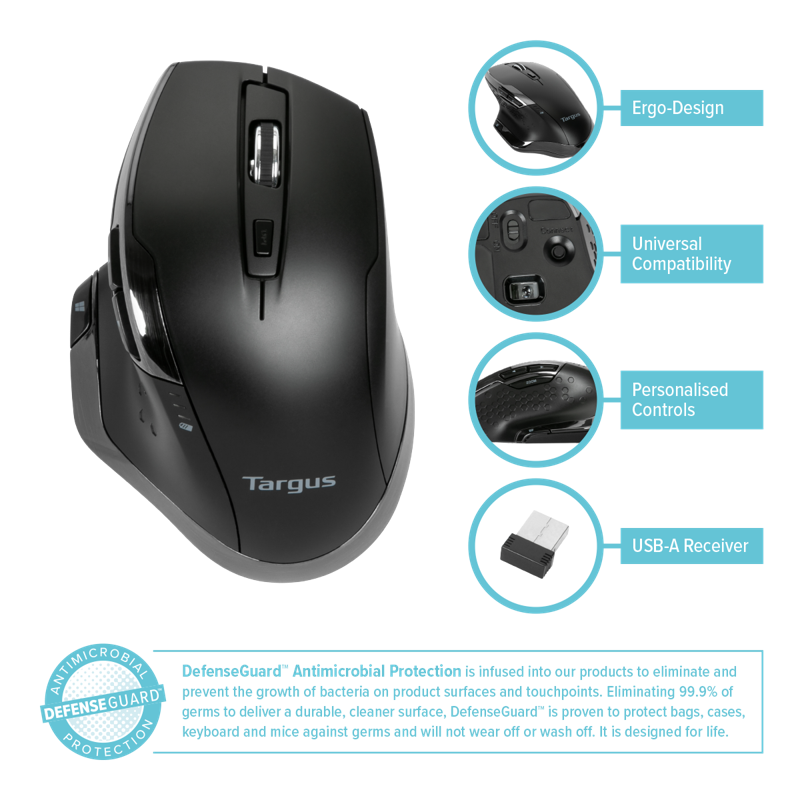 Targus Antimikrobinen Ergo Blue Trace -hiiri auttaa vähentämään ranteen rasitusta ergonomisen muotoilun ansiosta. Hiiren DefenseGuard Antimikrobinen ominaisuus on imeytettynä itse materiaaliin, joten se ei kulu pois, toisin kuin jälkikäteen käytettävät suihkeet. Antimikrobisen ominaisuuden ansiosta pinta pysyy puhtaampana ja se toimii jatkuvasti estäen mikro-organismien kasvun. Hiiren muotoilu tukee kämmenen ja ranteen luonnollista asentoa ja näin ollen vähentää rasitusta. Hiiri on suunniteltu käytettäväksi oikealla kädellä. Blue Trace 1600DPI -sensorin ansiosta hiiri käytännössä toimii kaikilla materiaalipinnoilla mukaan lukien puu, graniitti ja kangas. Plug and Play -asennus, ainoastaan kytke USB-A-vastaanotin tietokoneeseen muodostaaksesi langattoman yhteyden. Seitsemän painiketta: Left/Right click, Back/Forward, App-Switch, Wheel mode-shift, Middle Click.