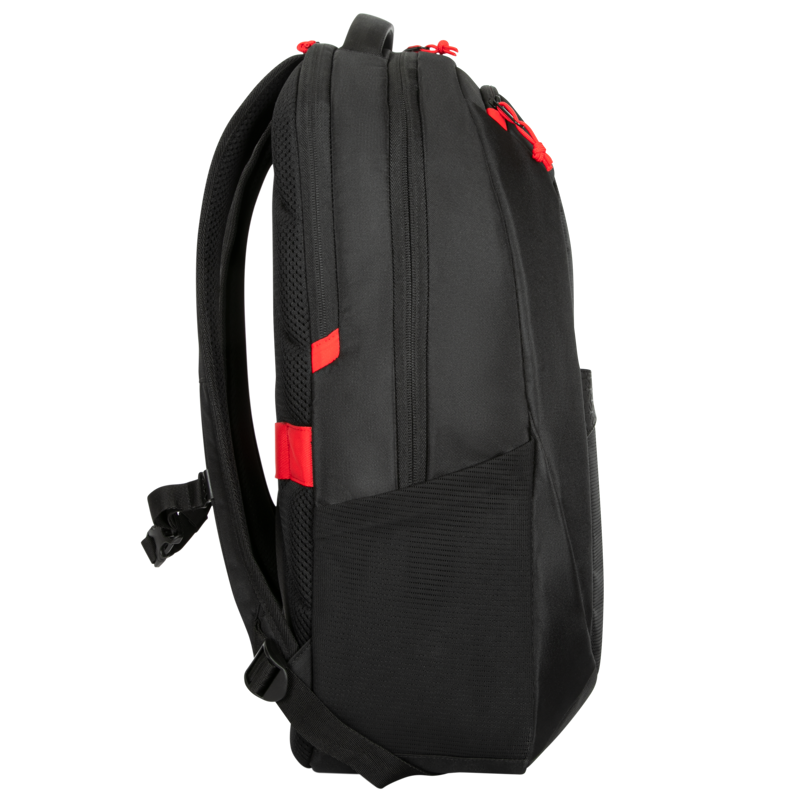 Targus 17.3” Strike II -pelireppu auttaa sinua kuljettamaan varusteitasi helposti ja tyylillä, olitpa sitten matkalla pelitapahtumaan, kaverin luo pelaamaan, tai yhtä hyvin työpaikalle tai kouluun. Strike II repussa on kaksi tilavaa osiota, joihin mahtuu jopa 17.3 tuuman pelikannettavasi, sekä suosikkitarvikkeet pitäen ne myös hyvässä järjestyksessä. Tässä pelaajille suunnitellussa repussa on kätevä pikakiinnitteinen remmi sankakuulokkeille, joten kuulokkeet eivät pääse pyörimään repun pohjalla. Repun ergonomiset olkahihnat ja verkkoselkäpehmusteet tekevät siitä mukavan kantaa pitäen myös selkäsi mahdollisimman viileänä. Repussa on myös vahvistettu kantokahva, sekä hihna, jonka avulla sen saa kiinnitettyä matkalaukun vetoaisaan. Tämä tyylikäs ja toiminnallinen reppu on tilavuudeltaan 27 litraa, joten siellä kulkee kannettavan tietokoneen lisäksi helposti mukana niin tablet-laitteesi, kuin myös kaikki tarvikkeet ja varusteet, joita päiväsi aikana tarvitset. Repun ulkopuolella sivuilla on kaksi pullotaskua, joissa esim. vesipullot kulkevat kätevästi ja helposti saatavilla.
