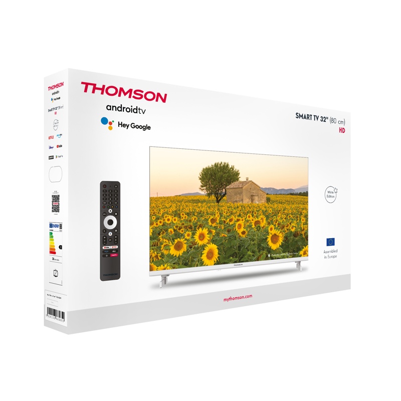 Thomson 32" HD Android TV, kaukosäädin, paristot kaukosäätimeen, virtajohto käyttöopas