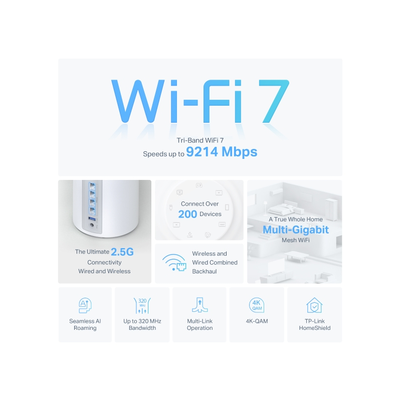 Deco BE65 on koko kodin WiFi 7 Mesh -järjestelmä. Kolmitaajuuksinen WiFi tarjoaa huippunopeuden 9214 Mbps – 5760 Mbps (6GHz), 2880 Mbps (5GHz) ja 574 Mbps (2.4GHz). Neljä 2,5 Gbps porttia takaavat maksimaalisen joustavuuden ja tehostetun tiedonsiirron. Multi-Link Operation (MLO) mahdollistaa tiedon samanaikaisen lähettämisen ja vastaanottamisen eri taajuilla ja kanavilla parantaakseen tiedonsiirtoa, vähentämään viivettä ja parantamaan luotettavuutta. 320 MHz:n kanavat kaksinkertaistavat kaistanleveyden ja mahdollistavat useammat samanaikaiset lähetykset mahdollisimman nopeilla nopeuksilla. 6 GHz taajuuden käyttö minimoi ruuhkautumisen tarjoamalla vahvoja nopeita yhteyksiä. TP-Link HomeShield tarjoaa kattavan verkkosuojauksen, tehokkaat vanhempien valvontatyökalut ja reaaliaikaisen IoT-turvallisuuden. Lisäksi järjestelmä on taaksepäin yhteensopiva kaikkien Wi-Fi-sukupolvien kanssa.