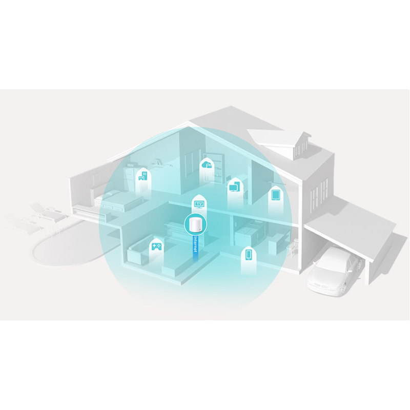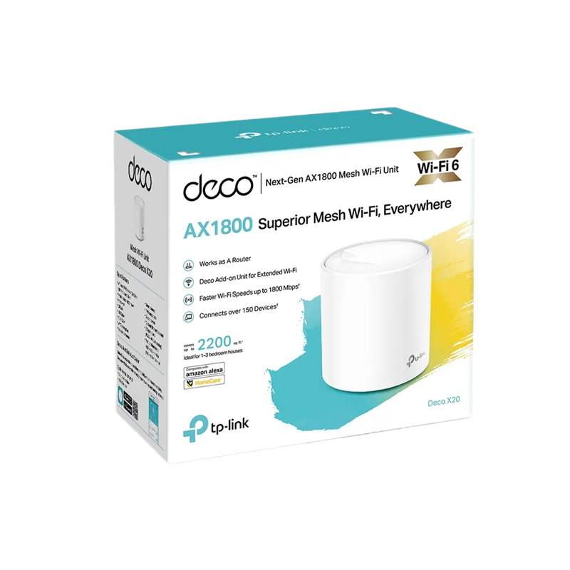 Deco X20 -mesh-tukiasema luo yhtenäisen WiFi-verkon, jolla voit nauttia saumattomasta yhteydestä liikkuessasi kodissasi. Deco X20 tukee WiFi 6 -standardia ja se pitää verkon vahvana kotisi koosta ja rakenteista huolimatta. Yhdellä Deco X20 WiFi 6 -mesh-tukiasemalla katat jopa 200 neliömetrin kokoisen tilan yhtenäisellä WiFi-verkolla. Kahdella asemalla puolestaan kattavuus on jopa 370 neliömetriä, ja kolmella asemalla jopa 500 neliömetriä. Deco X20:n käyttämä 802.11ax -standardi tukee 2.4 GHz:n (574 Mbps) ja 5 GHz (1201 Mbps) taajuuksien samanaikaista käyttöä, jolloin yhdistetty langaton nopeus on jopa 1800 Mbps. Neljä tehokasta sisäänrakennettua antennia mahdollistavat erittäin kattavan verkon ja Gigabitin Ethernet -liitännät siirtävät suuretkin tiedostot nopeasti langallisessa verkossa. Deco X20 WiFi 6 -mesh-tukiasema tukee jopa 150 yhtäaikaista käyttäjää.