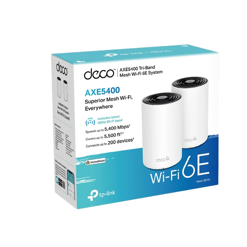 Deco XE75 on kolmitaajuuksinen Wi-Fi 6E Mesh -tukiasema. Seuraavan sukupolven saumaton Wi-Fi tekee katvealueista ja puskuroinnista historiaa. Koe Wi-Fi:n uusin taajuus, joka eliminoi häiriöt kaikilta perinteisiltä laitteilta. 6 GHz taajuus tarjoaa lisää Wi-Fi-suorituskykyä ja kanavanleveyttä. Todellinen kolmitaajuusnopeus ja tekoälyä hyödyntävä Mesh-tekniikka. Kaikki kolme Wi-Fi -taajuutta toimivat yhdessä vapauttaen verkkosi kokonaisnopeuden, jopa 5400 Mbps. Tekoälyä hyödyntävä Mesh-tekniikka yhdistää kotisi yhden nimen ja salasanan alle tarjoten parhaat yhteydet liikkuessasi huoneesta toiseen. TP-Link HomeShield pitää kotiverkkosi turvassa tarjoamalla huipputeknisiä ominaisuuksia verkko- ja IoT-suojaukseen. Deco-sovellus opastaa sinua asennuksessa vaihe vaiheelta. Yleinen yhteensopivuus takaa taaksepäin yhteensopivuuden kaikkien Wi-Fi-sukupolvien kanssa.