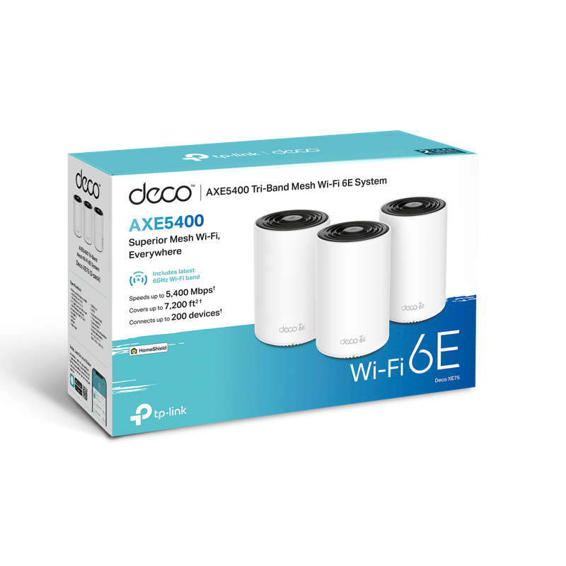 Valitusta tuotepaketista riippuen: 1-3 x Deco XE75 -mesh-tukiasema, 1-3 x virtalähde, 1 x RJ45-verkkokaapeli, pikaopas
