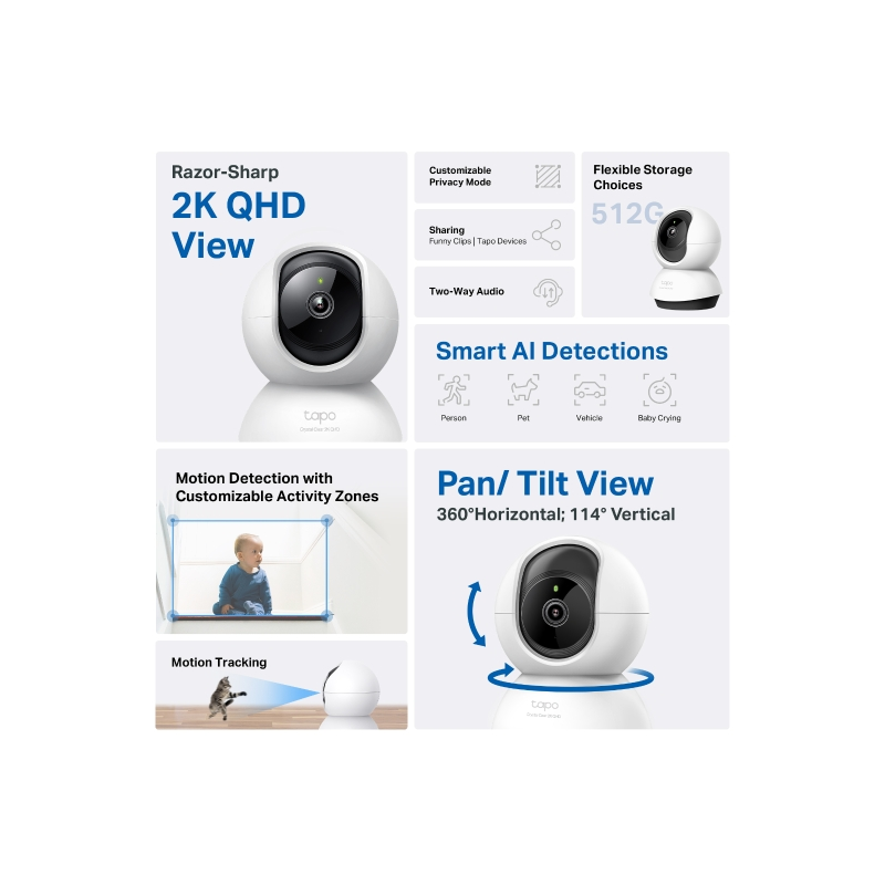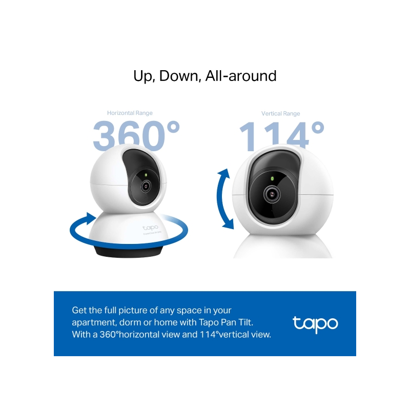 Tapo C220 -valvontakamera kuvaa tarkkaa 2K-kuvaa, joten näet jokaisen yksityiskohdan erittäin selkeästi. Kamera kääntyy 360 astetta ja kallistuu pystysuunnassa 114 astetta, minkä ansiosta kotisi on laajasti valvottu.