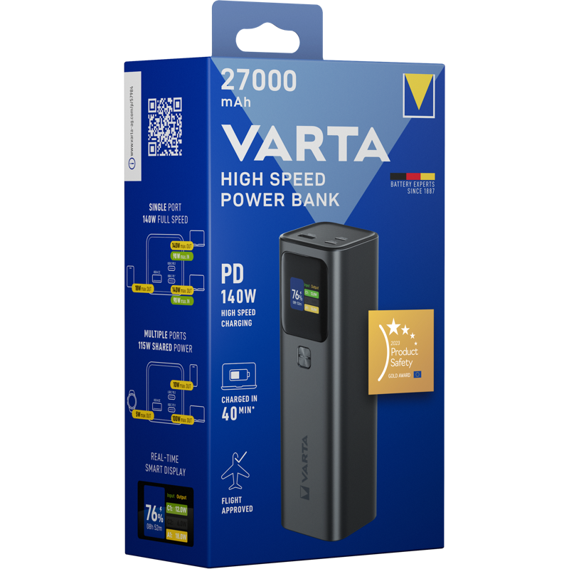 Tehokas High Capacity -virtapankki vaativaan ja liikkuvaan käyttöön. Suuri 27 000 mAh kapasiteetti ja jopa 140 W USB-C -teho mahdollistavat älypuhelinten, tablettien, läppäreiden ja muiden paljon virtaa vaativien laitteiden nopean latauksen – myös useita laitteita samanaikaisesti. Selkeä LCD-näyttö näyttää lataustiedot, ja virtapankki aktivoituu kätevästi On/Off-kytkimestä. Lentokoneeseen sallittu malli, tyylikäs alumiinikuori, mukana 140 W USB-C–USB-C -kaapeli sekä edistyneet turvatoiminnot.