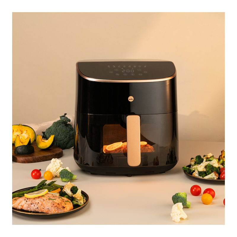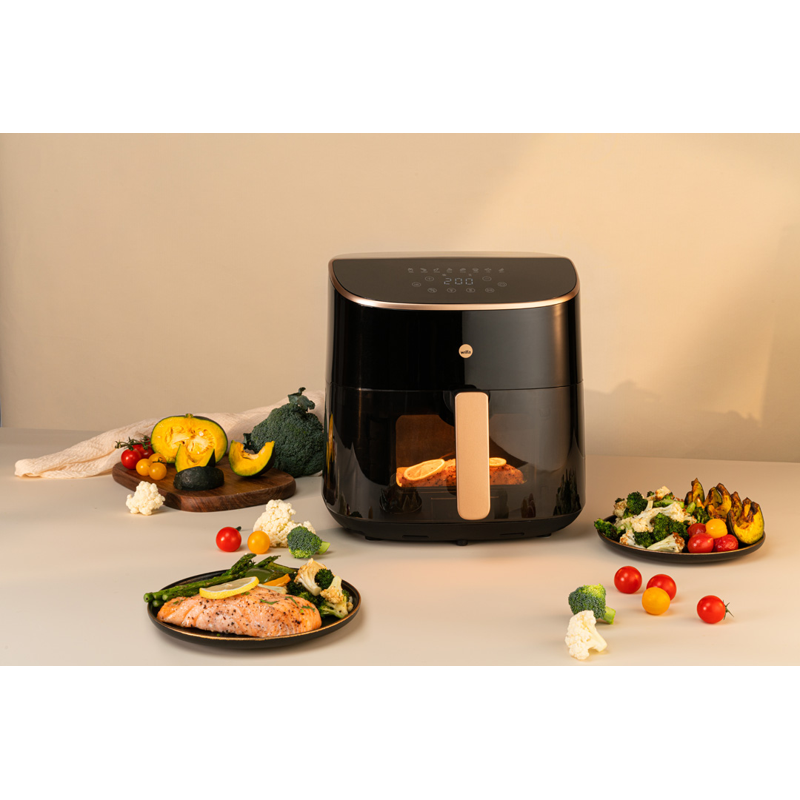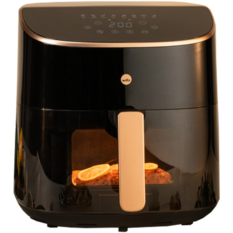 Wilfa AFD-80 Split Air Fryerin paistokorin tilavuus on 8 litraa, joten se mahdollistaa isompien määrien valmistuksen kerralla, Lisäksi voit jakaa korin kahteen osaan mukana tulevalla paistokorin jakajalla, jolloin voit valmistaa kahta ruokaa eri aikaan niin halutessasi. Wilfa Air Fryerissa on kätevä läpinäkyvä ikkuna, josta pystyt helposti seuraamaan ruoan valmistumista ilman erillistä luukun avaamista.