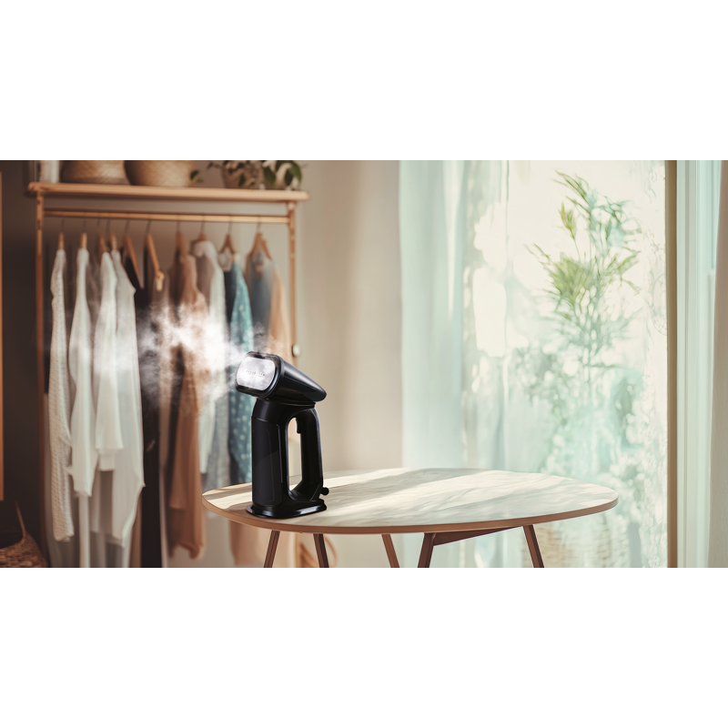 Irrotettava 200 ml vesisäiliö on helppo täyttää, ja merkkivalo ilmoittaa, kun on aika lisätä vettä. Kevyen rakenteen ja 1,9 metrin johdon ansiosta vaatteiden höyrytys onnistuu vaivattomasti suoraan henkarissa.