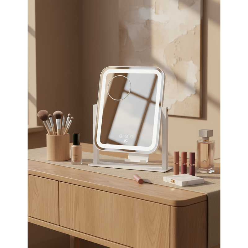 - Neljällä sivulla oleva LED-valolista, säädettävä kallistuskulma ja mukana tuleva suurennuspeili tekevät siitä täydellisen tarkkaan meikkiin – myös pienissä tiloissa