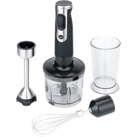 Astioiden naarmuuntumisen estävä sekoitussauva ergonomisella muotoilulla, minisilppuri luistamattomalla pohjalla, vispilä ja 600 ml mittakannu, säädettävät nopeusasetukset, moottorinsuojausjärjestelmä