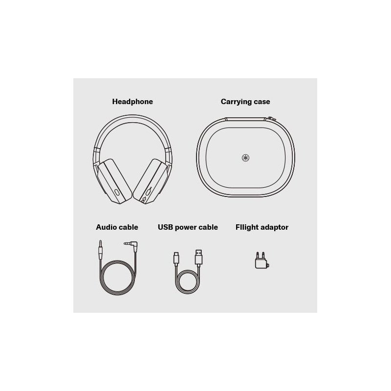 Yamaha YH-E700B -kuulokkeet, kantolaukku, USB-C-kaapeli, 3,5 mm to 3,5 mm audiokaapeli, lentokoneadapteri, pikaopas
