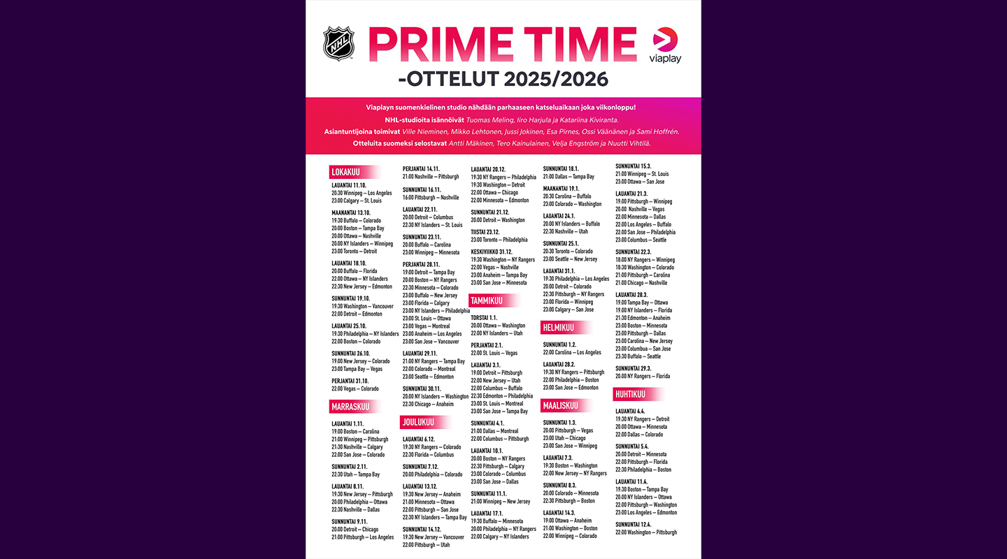 Katso NHL-kauden 2025–2026 ottelut runkosarjan alusta aina Stanley Cup -finaaleihin asti. Voit seurata NHL-pelejä V premium -kanavapaketilla – myös parhaaseen katseluaikaan ja suomeksi selostettuna! Viaplay esittää jopa 145 prime time -ottelua ja studiolähetyksiä viikoittain.