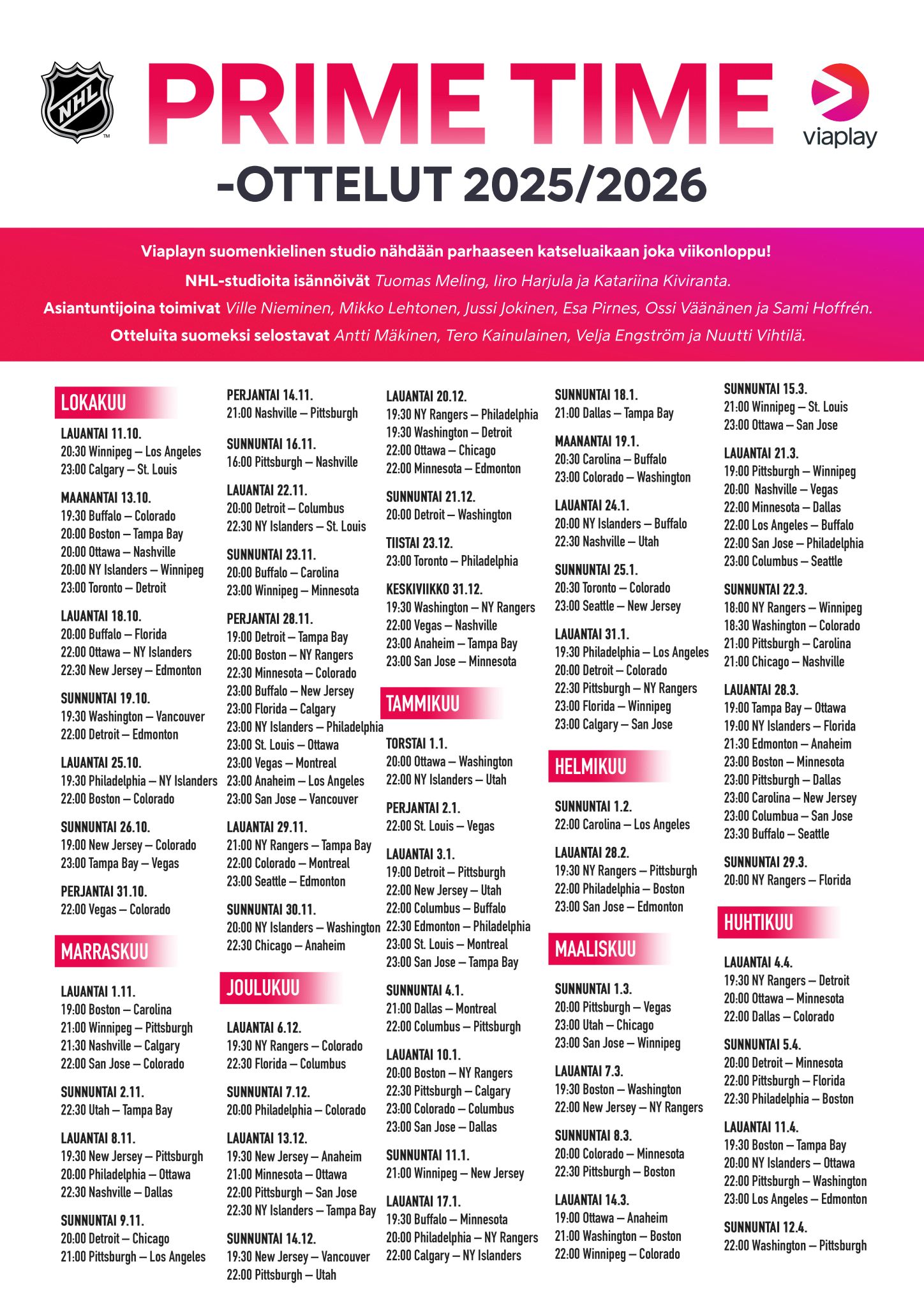 Runkosarjassa pelataan tällä kaudella 1312 ottelua, joista jopa 145 nähdään suomalaisittain parhaaseen katseluaikaan. Otteluiden suomenkielisestä selostuksesta vastaavat Antti Mäkinen, Tero Kainulainen, Velja Engström ja Nuutti Vihtilä. Myös yksi suomenkielinen NHL prime time -studiolähetys tarjoillaan jokaisella peliviikolla. NHL-otteluita näytetään seuraavilla kanavilla: Viaplay 1 Urheilu, Viaplay 2 Urheilu, Viaplay 3 Urheilu, V sport vinter, V sport 1 HD, V sport live -kanavat 1–5.